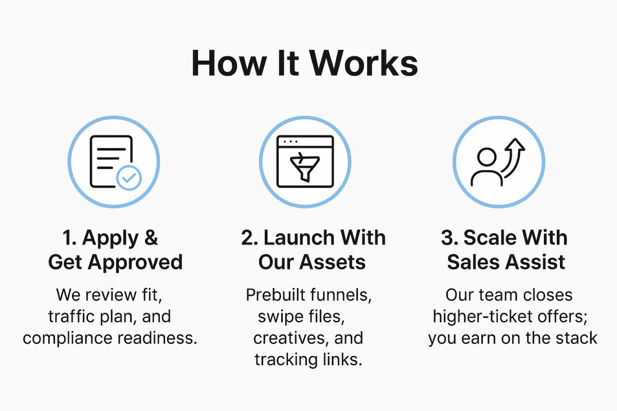A typical top partner promotes a $497–$1,497 class, drives 20–30 paid seats/month, and participates in backend upsells we fulfill. Your focus: quality traffic + warm introductions.